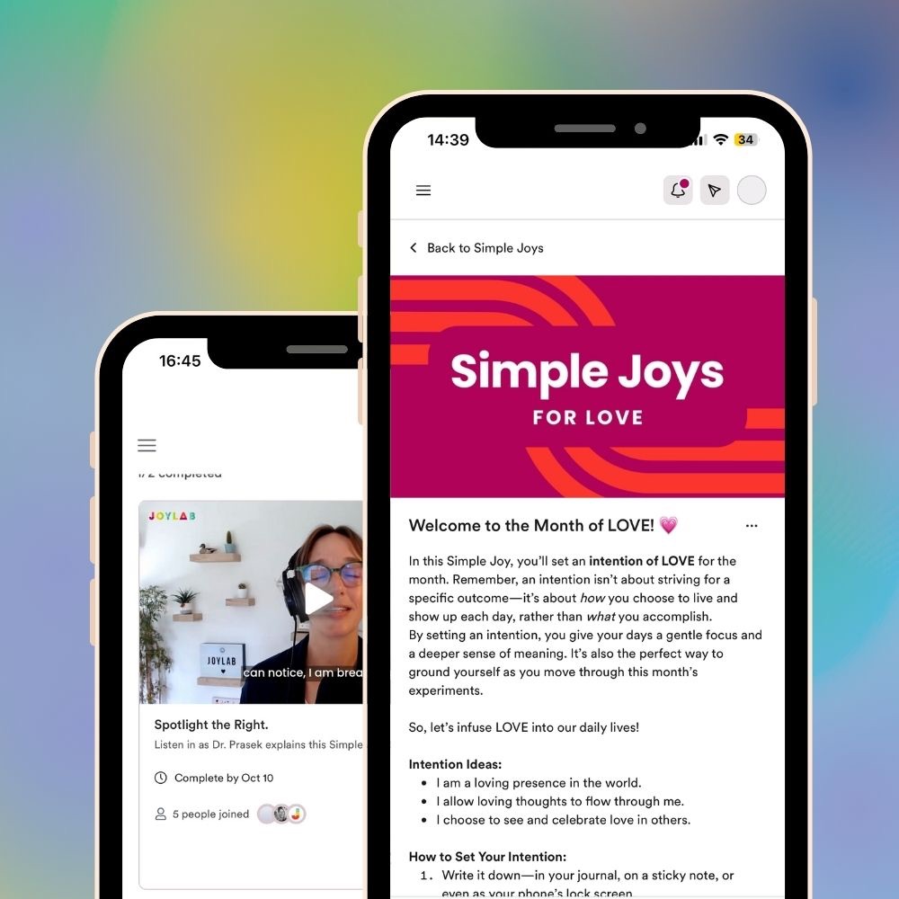 Simple Joys are daily steps we can add to our lives to build more pathways to joy. We’ve designed them to be simple, accessible, always doable, and sometimes even fun! Download the (free!) Joy Lab app and start building more joy into your life.